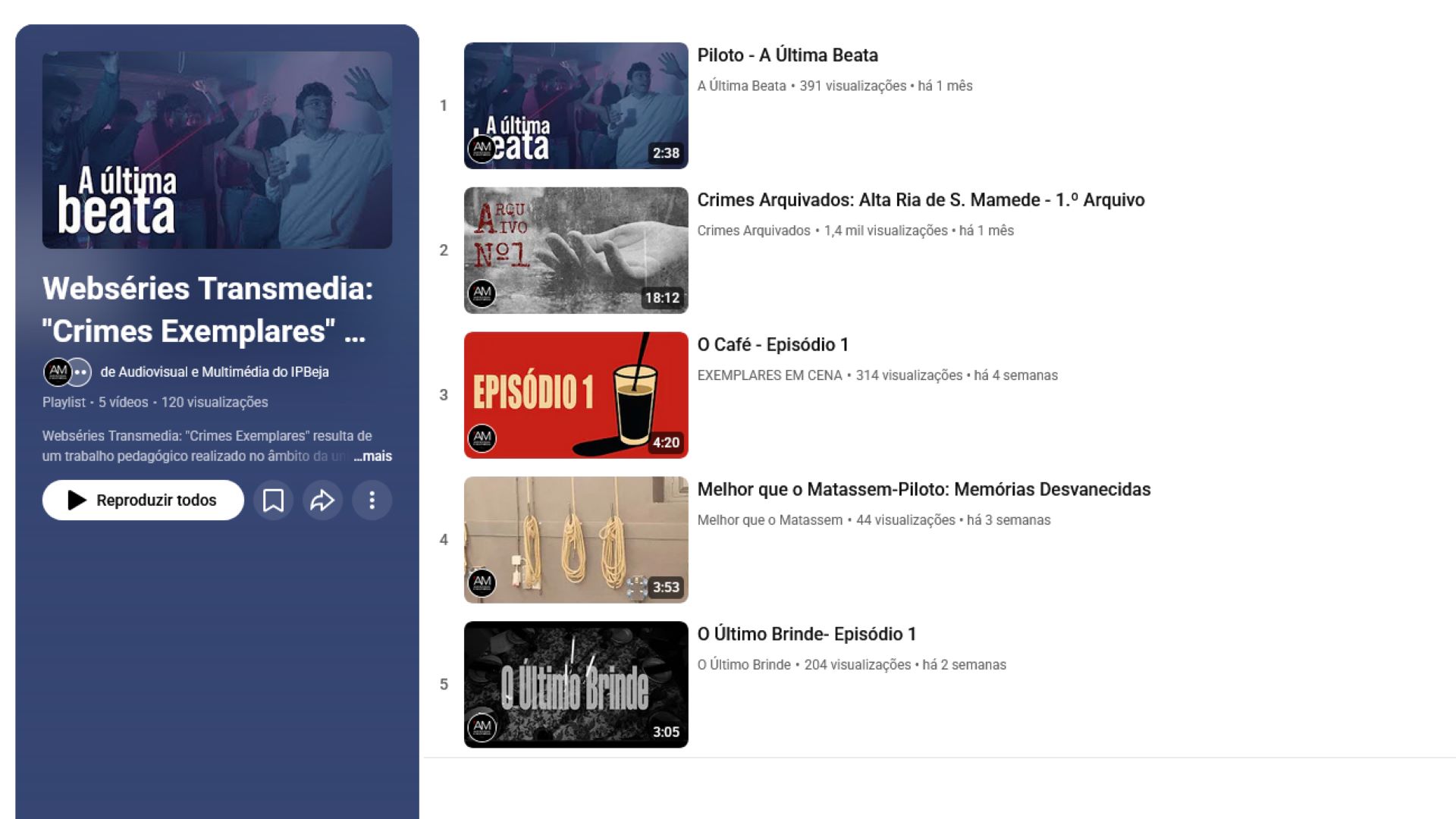 Os episódios piloto das webséries encontram-se disponíveis numa playlist no canal de YouTube do curso de Audiovisual e Multimédia do IPBeja, acessível em: https://www.youtube.com/playlist?list=PL3NCnHxz7t87fjA1OERzYrjvF495Yq4eH.